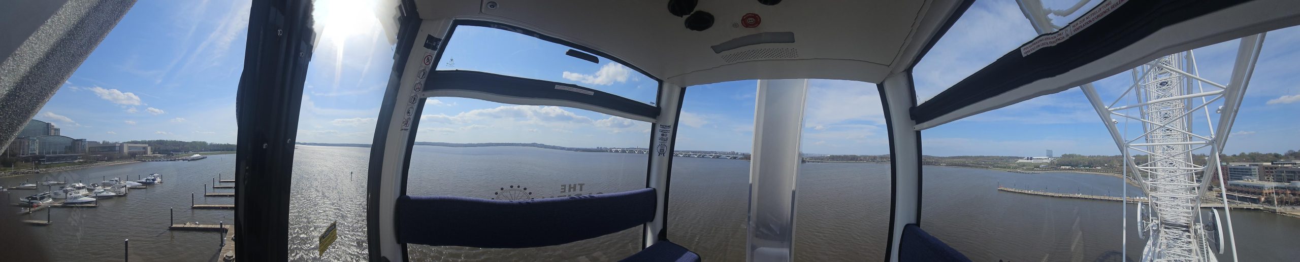 After getting several shots, I slowly made my way to my destination, The Capital Wheel. The wheel’s gondolas are climate-controlled with space for a small group. For me, the attraction of the ride was the opportunity to get high views of the area, from the boats in the harbor, to the Wilson Bridge, to points further along the river. Below is a panoramic photo from my seat and others are further down.
