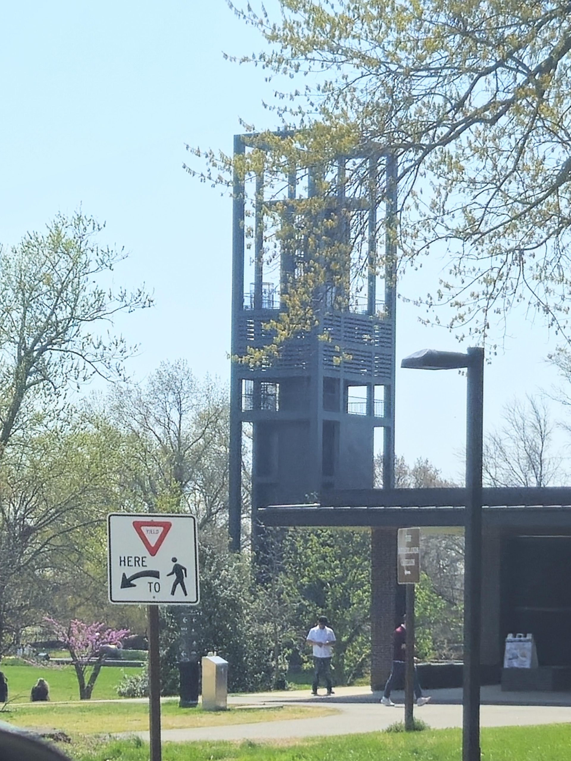 As I approached the area, I realized that I had been there before, during my evening tour of the DMV. I’d seen the structure then but didn’t know what it was, so I was pleasantly surprised to learn that it had a musical function. I had arrived a few minutes before the scheduled noon automated musical performance. This gave me enough time to add the telescopic lens to my phone and to get a few test shots of the area. The picture to the right has pretty good detail, but I need to practice more with the lens to see how to best take advantage of its capabilities.