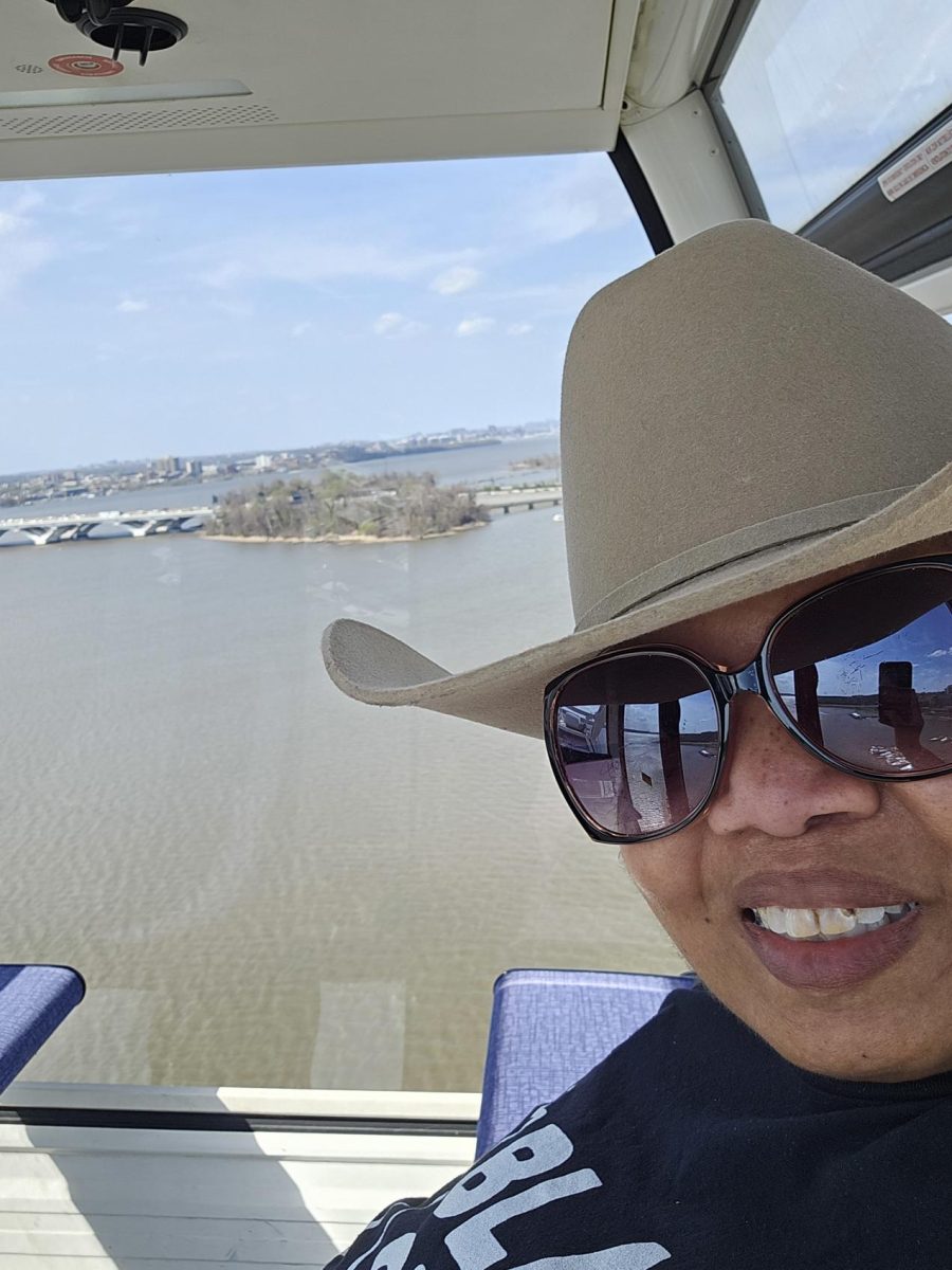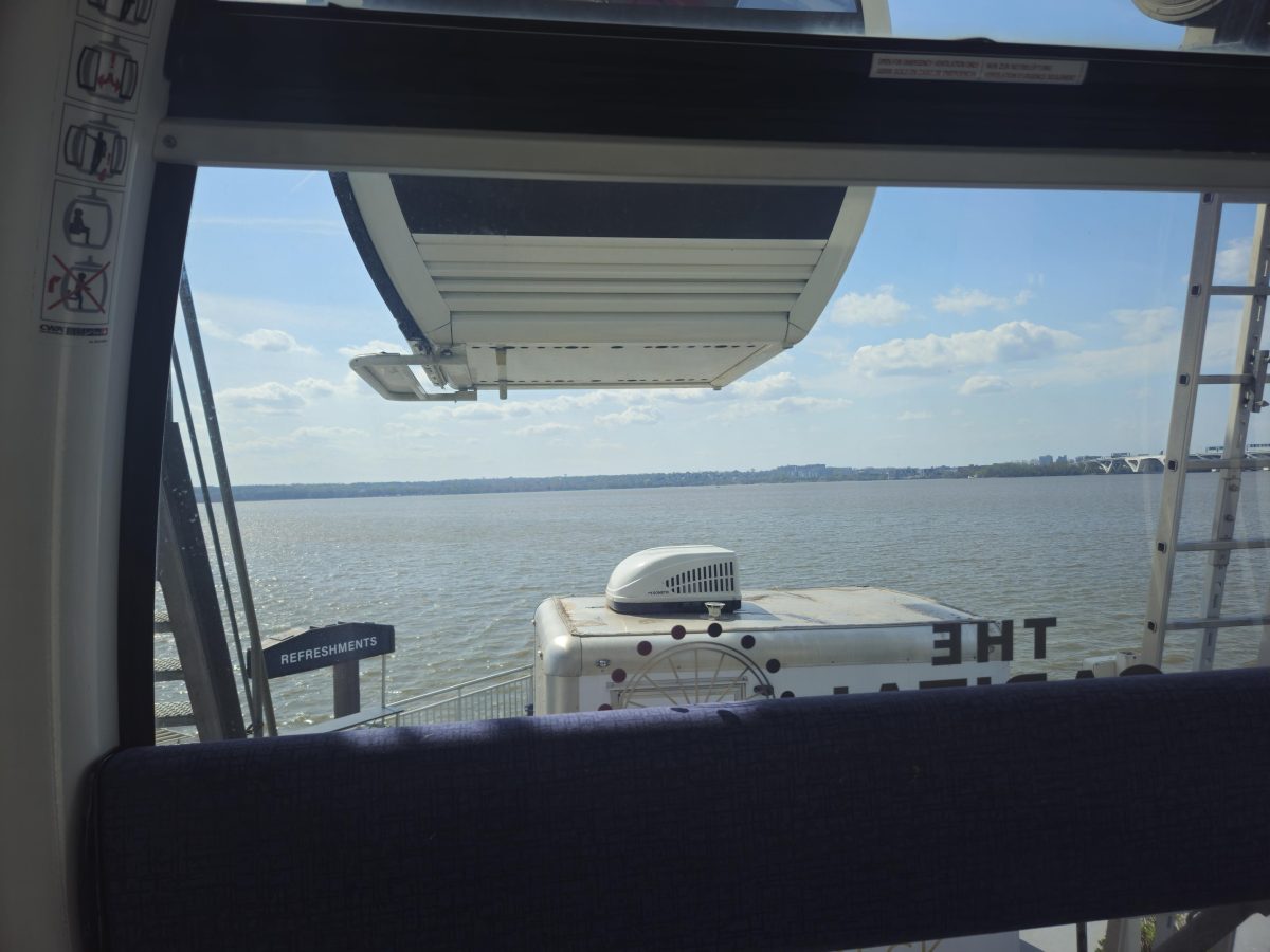 After getting several shots, I slowly made my way to my destination, The Capital Wheel. The wheel’s gondolas are climate-controlled with space for a small group. For me, the attraction of the ride was the opportunity to get high views of the area, from the boats in the harbor, to the Wilson Bridge, to points further along the river. Below is a panoramic photo from my seat and others are further down.