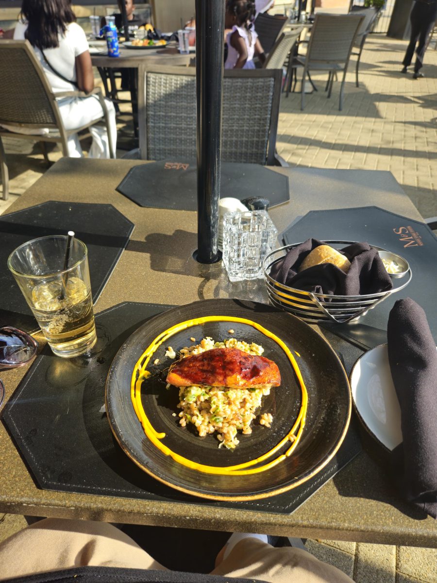 As I walked back towards SB, I decided to have an early dinner at one of the harbor restaurants, McCormick & Schmick’s. I’m not usually terribly adventurous when ordering meals since I don’t want to pay for a meal I don’t enjoy eating. For some reason, though, I made an exception and ordered their Sugar & Spice Cedar Roasted Salmon on a bed of farro risotto, with butternut squash puree and balsamic brown butter. I wasn’t surprised that the salmon was very good, but the risotto was a very pleasant surprise. Even the puree was tasty, and I am not normally a fan of squash in any form. A picture of the meal is below. Maybe it was all due to the ambience of an outdoor seat within sight of the river, or maybe it was just excellent food preparation,… on an outdoor deck near the river.
